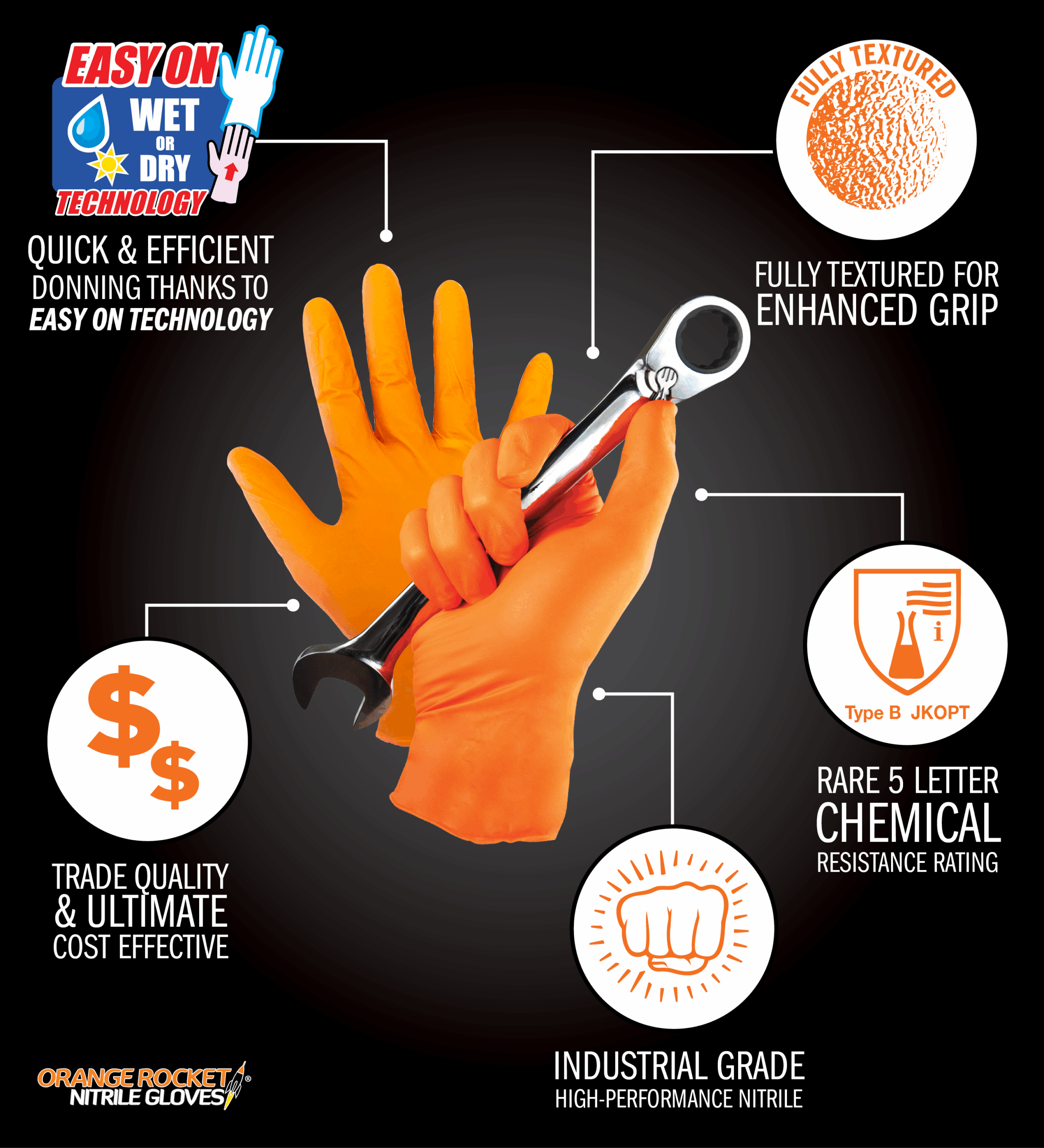 When wearing Orange Rocket Gloves you can physically feel the EASY ON difference. EASY ON Technology enables your hand to maintain its optimal pH level, creating an easy comfortable experience for the user. In a world where time is money. The Glove Company saw the need for a disposable glove that works with the wearer. Gloves that are easy to put on and easy to take off no matter what.